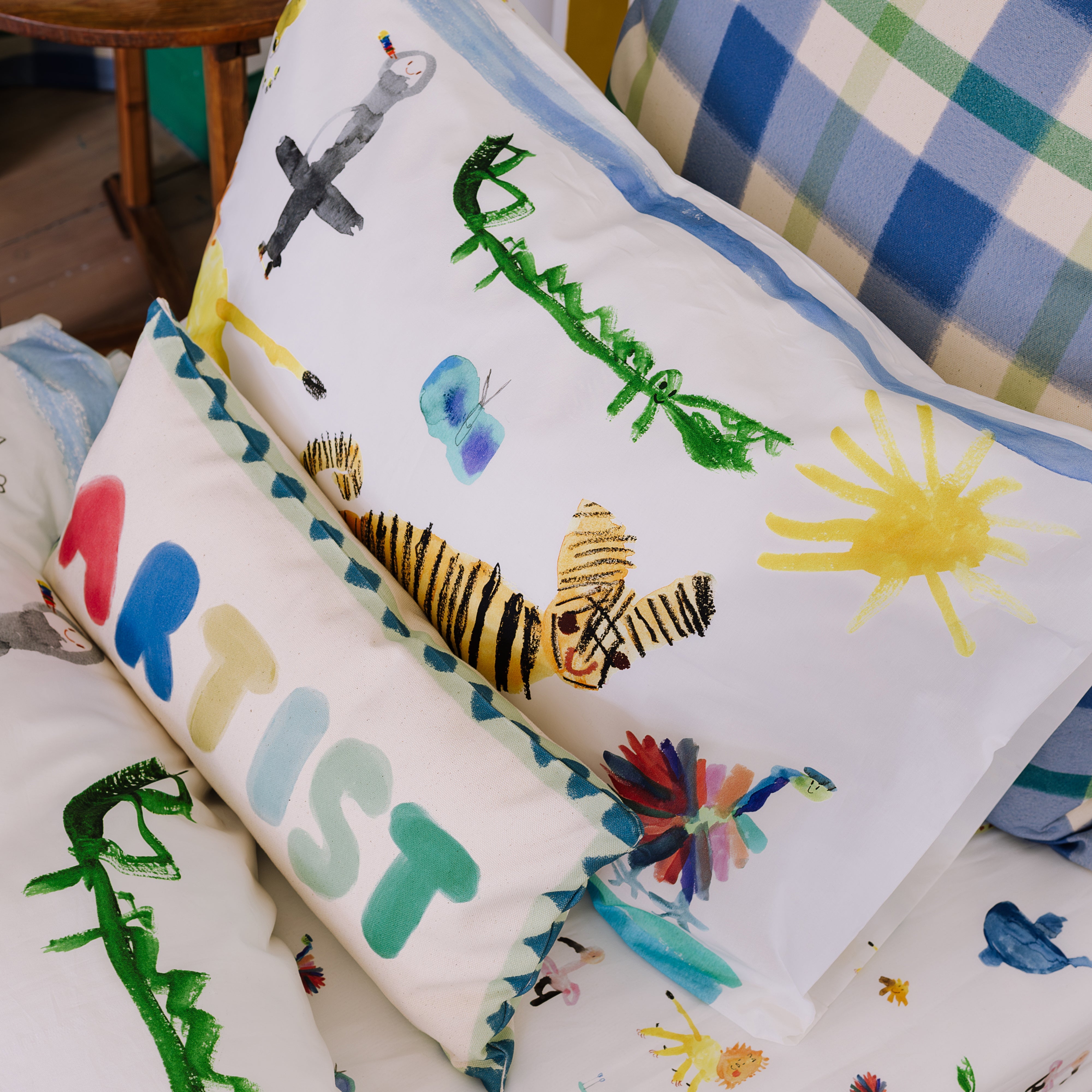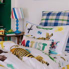 This bold cushion features the word “ARTIST” in playful, hand-painted letters, each in a different cheerful colour. Framed with a vibrant, hand painted, patterned border, it’s a fun, creative accent piece perfect for inspiring little artists.
