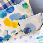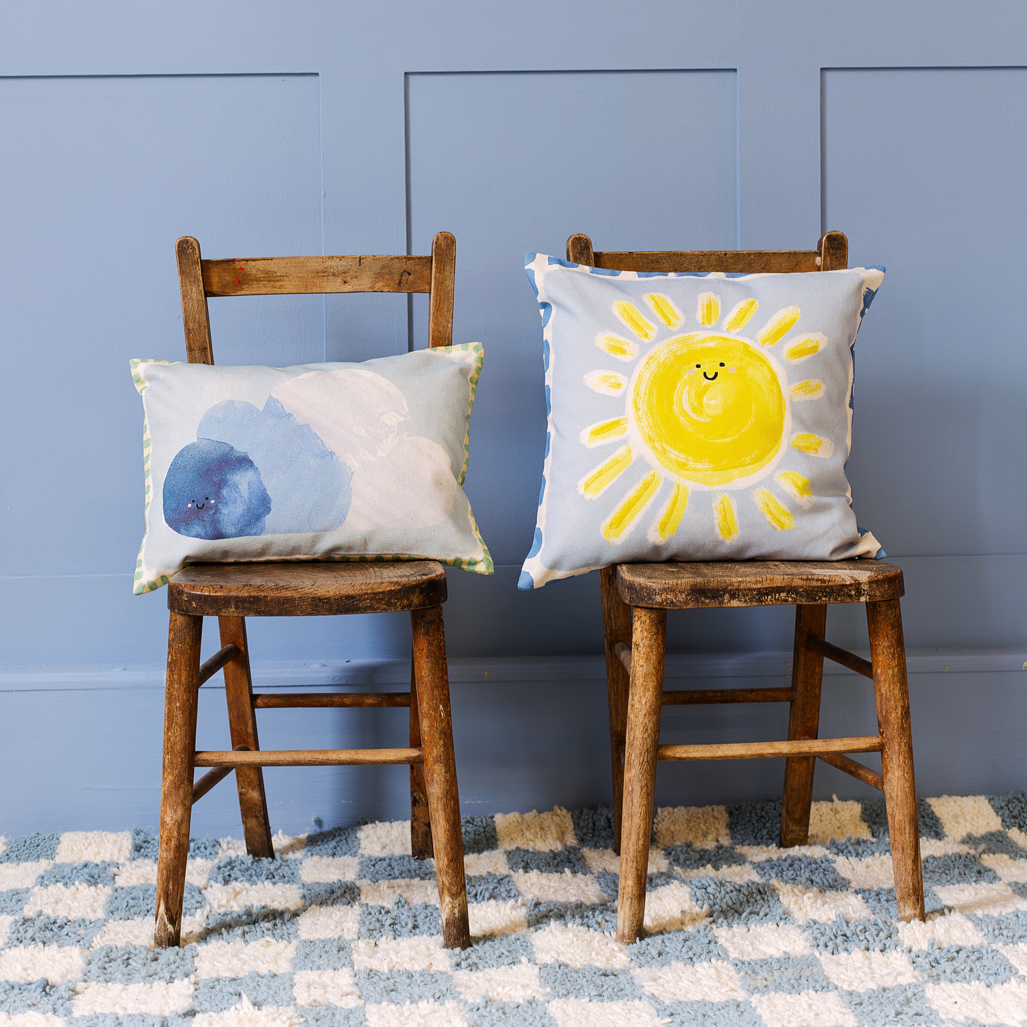 This charming cushion features a soft, watercolour cloud with a sweet, smiling face, bringing a gentle, dreamy touch to any child’s space. Framed with a playful painted striped border to complete the look.