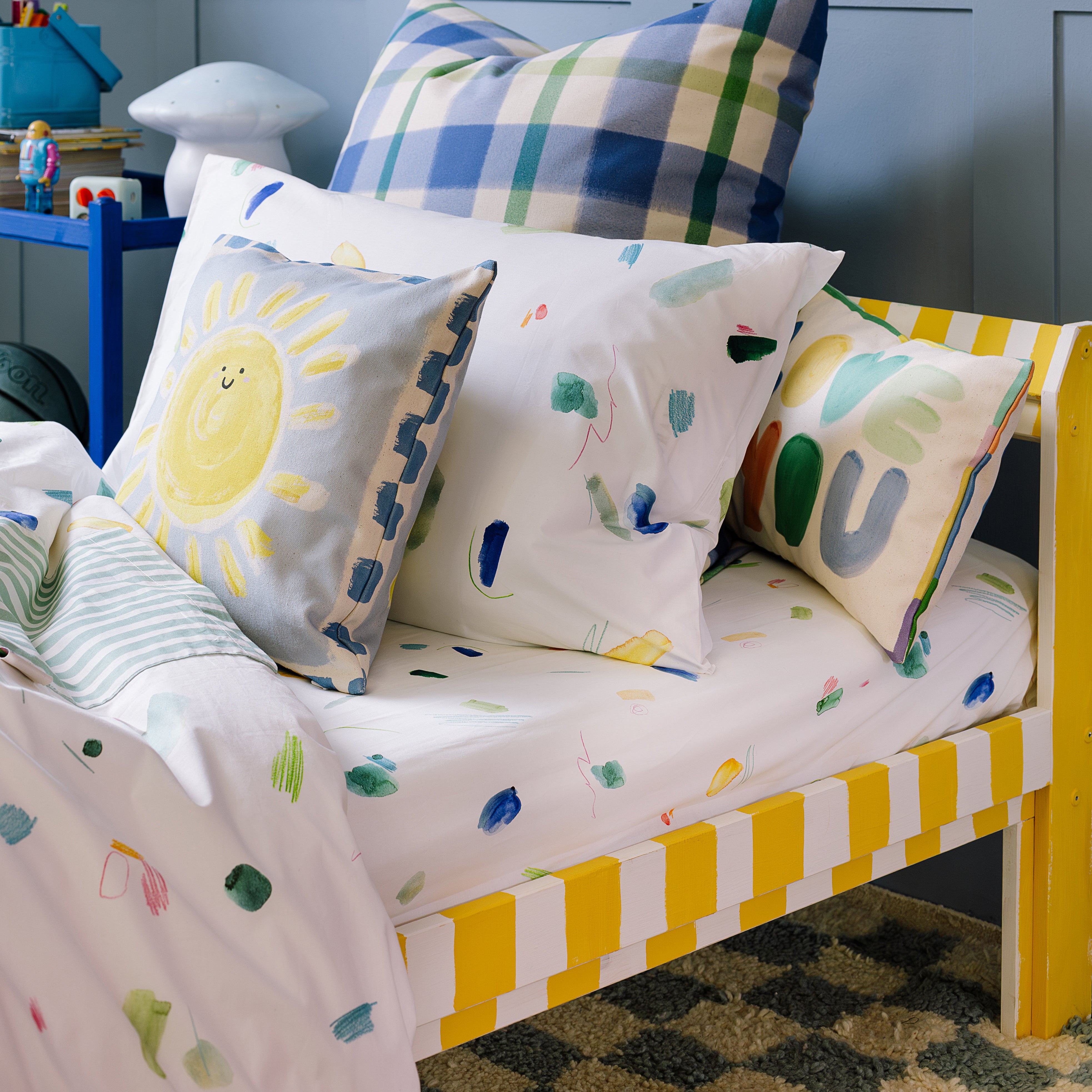 Our cushions, crafted in Scotland, are designed to be cosy companions for little dreamers, adding both style and comfort to children’s spaces. Made with organic, OEKO-TEX® certified fabrics, they ensure a safe and gentle touch for young ones. With delightful patterns and colours that appeal to kids and design-conscious parents alike, these cushions are perfect for curling up with a favourite book or adding a splash of character to any room. Although... it's not just a cushion - it’s a pillow fort, a speed boat, a cosy castle. Wee Blue Bell Cushions bring a touch of magic, comfort, and creativity to every corner they adorn.
