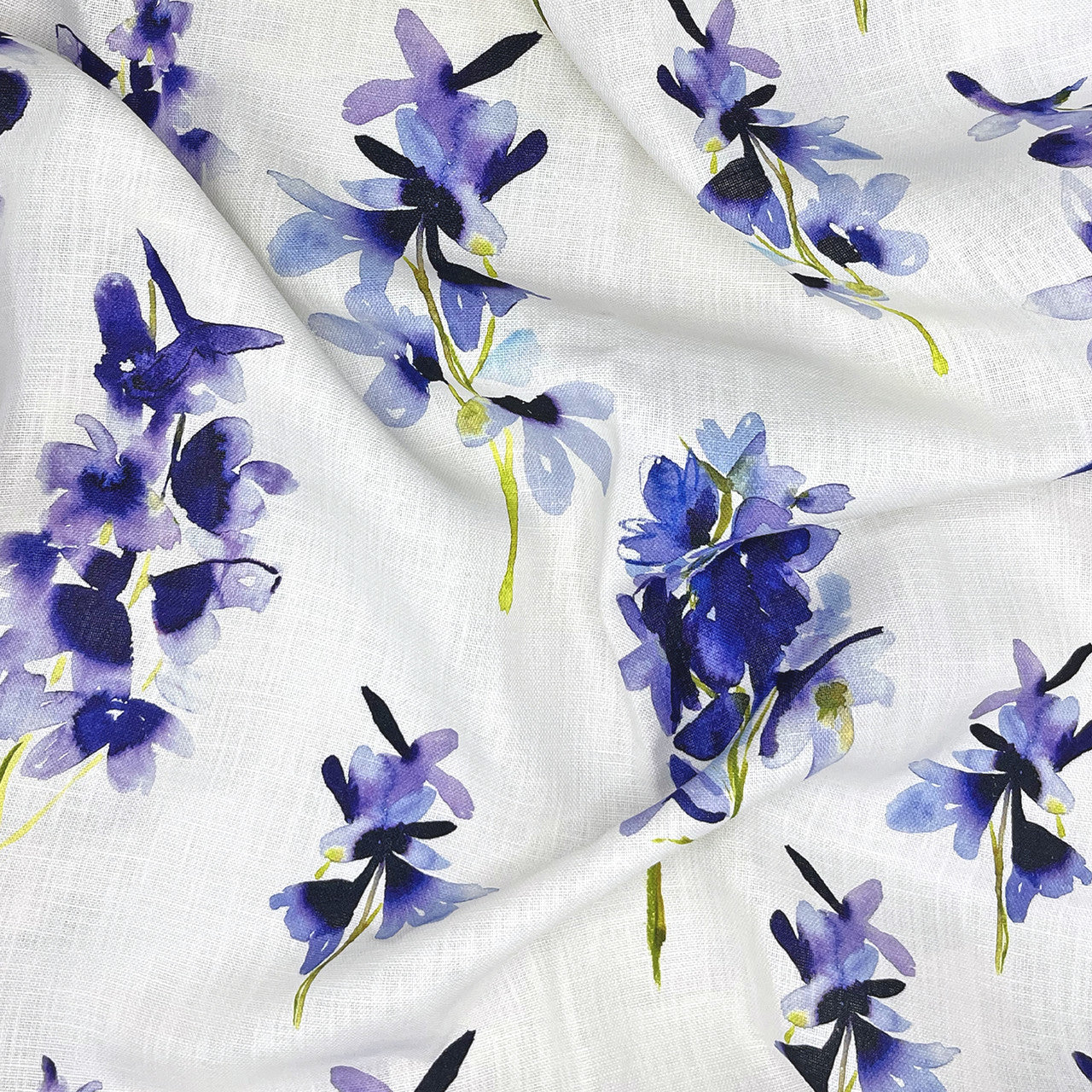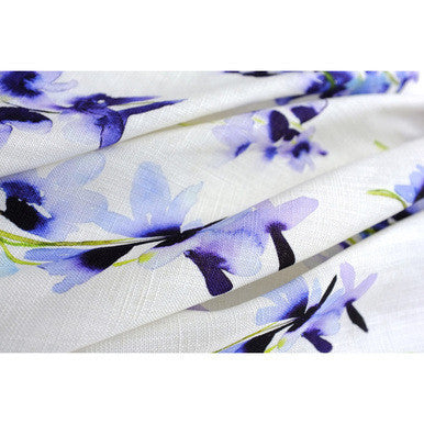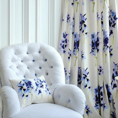 The Delphinium fabric is the perfect combination of blue hued, delphinium florals and zesty chartreuse green stems on a clean, off white ground.