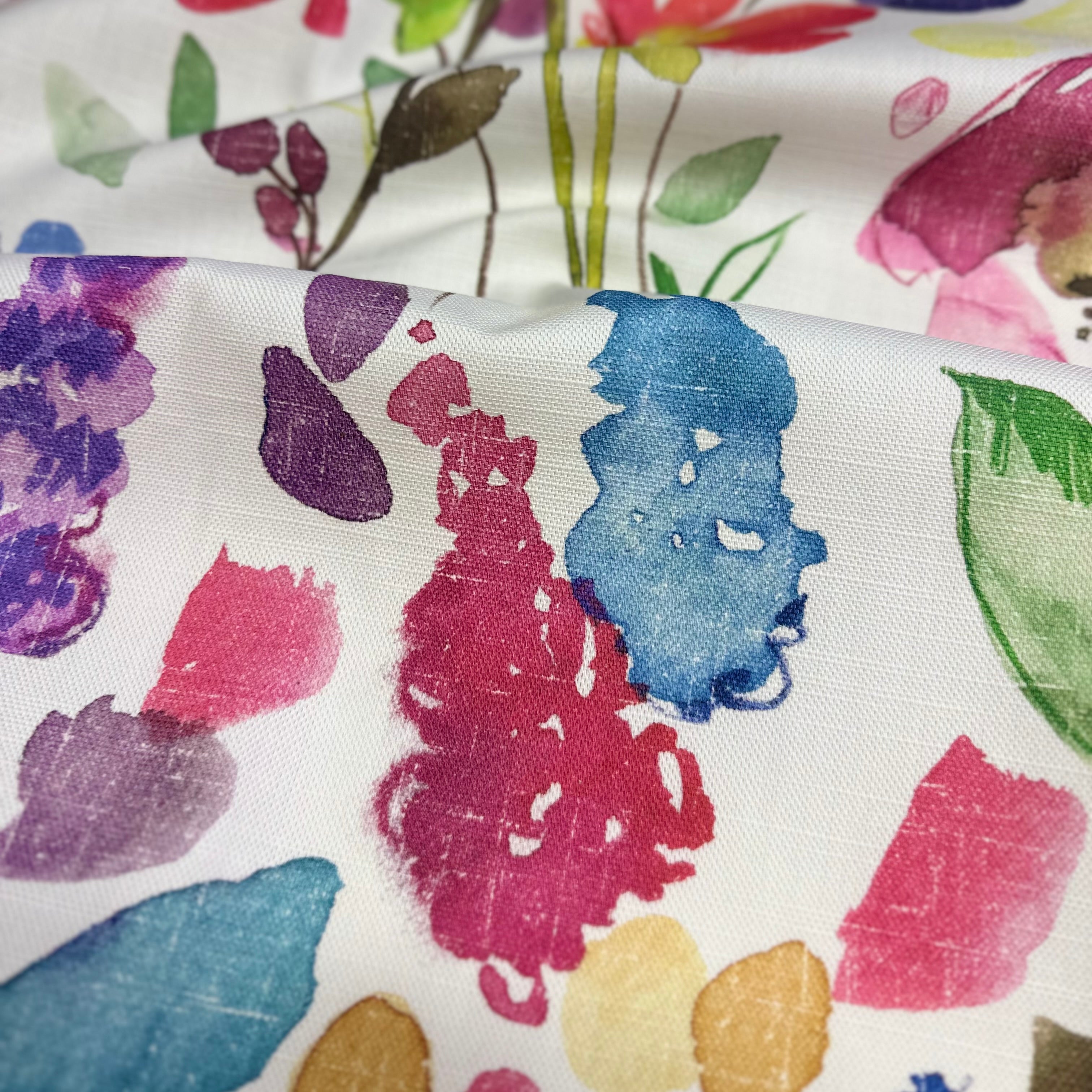 Introducing Devon, a special floral design from the Bluebellgray archives, a watercolour floral in fresh reds, hints of purples, green foliage, and soft browns. The loose, flowing composition feels both romantic and natural. Devon is a celebration of colour, offering a timeless, vibrant statement with its organic, painterly strokes.