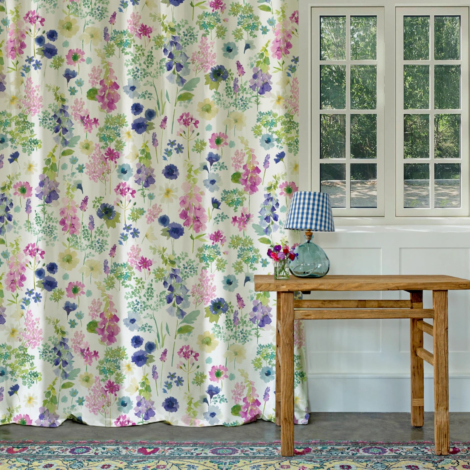 Painterly, watercolour foxgloves entwined with delicate stems of foliage and cornflowers create an uplifting and joyful design. Featuring a fresh colour palette of blush pink, bright green and inky purple-blues.