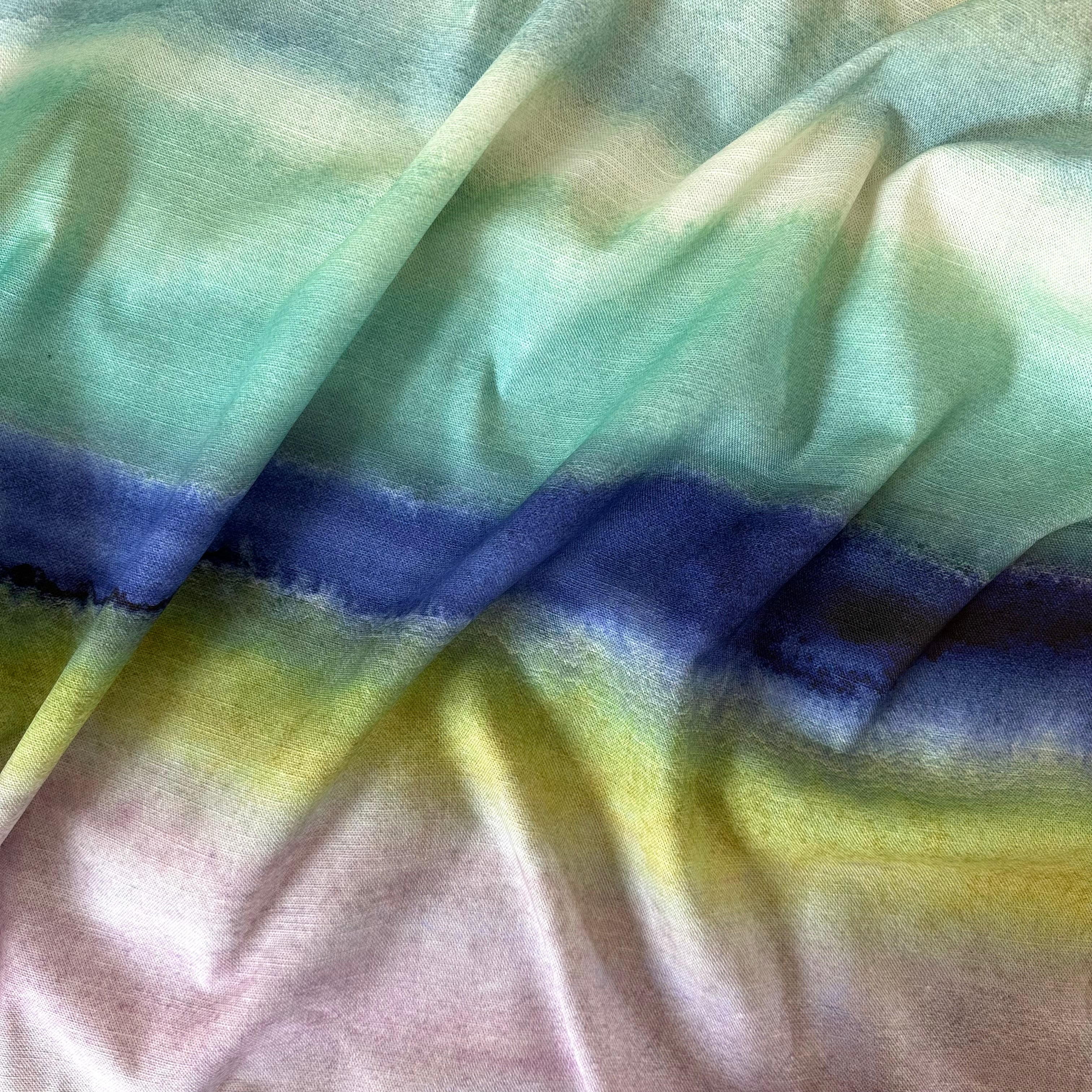Reminiscent of the beautiful beaches on the Hebridean islands of Scotland, Hebrides is a bold and beautiful watercolour stripe design full of colour. Turquoises and blues are evocative of the colours of the sky and sea, it's our Bluebellgray take on a seascape.