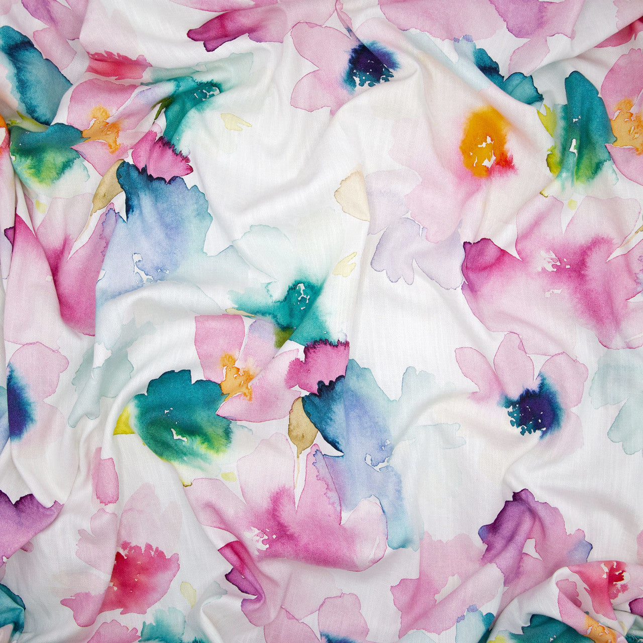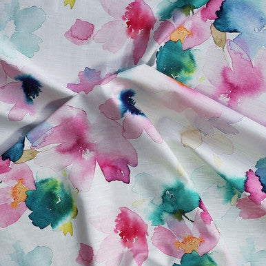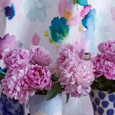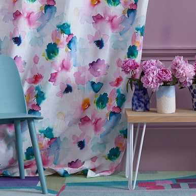 Bring joy to your cushions, curtains and upholstery with our uplifting Sanna floral fabric, starring oversized watercolour blooms. Soft pinks and dusty oranges strike a delicate balance with the ink-splash blues and energising teal, in a print that's as innovative as it is timeless.Fiona's styling notes: This floral fabric design is soft and romantic, so keep walls soft too, with soft whites or pale dusty pinks.