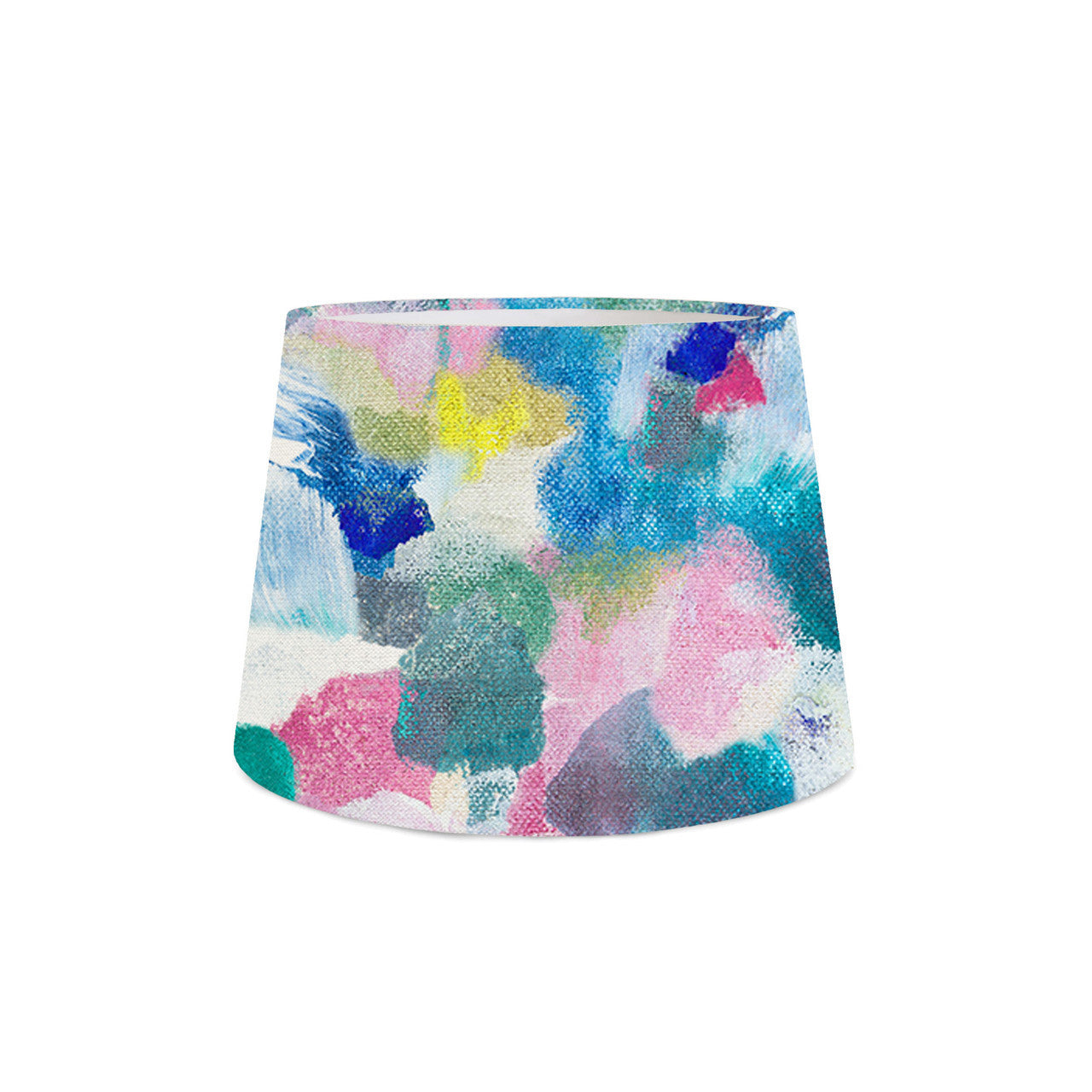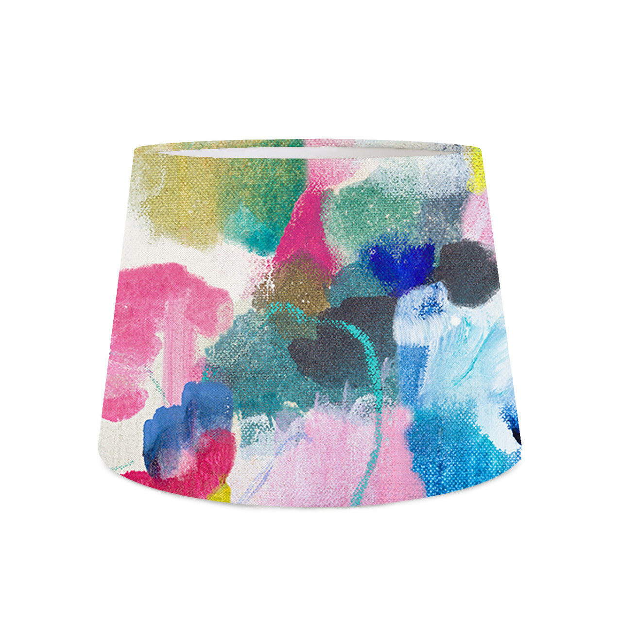 The Seafield Fabric is inspired by the ever-changing gardens and landscape views seen from Fi's childhood home and boasts energetic colours and expressive mark making. The rolling hills and cloudy skies were first depicted in textural abstract marks painted onto canvas before being printed onto this vibrant fabric and made into the Seafield Retro Lampshade. Available in 3 sizes - 18", 14" and 10".