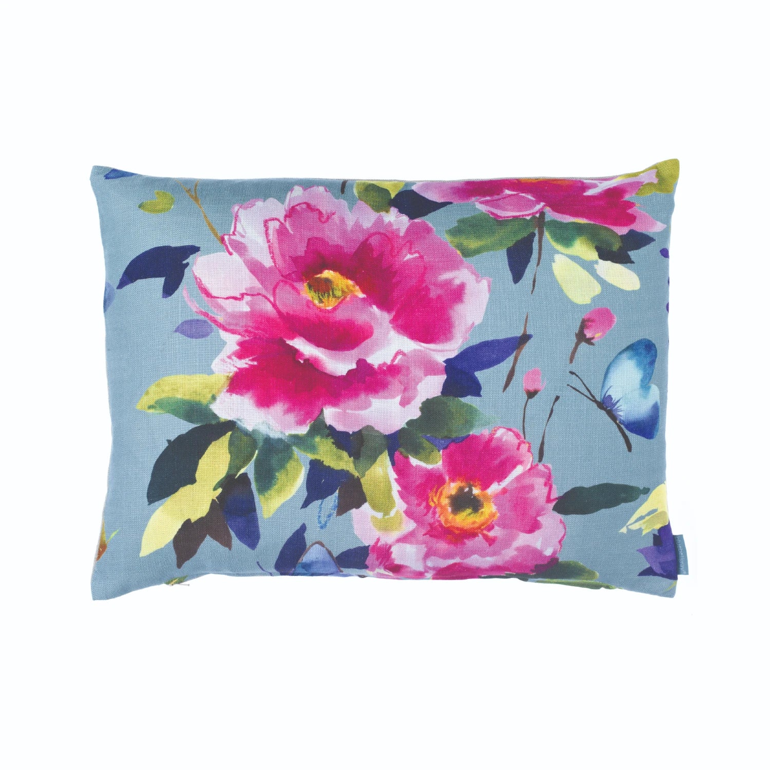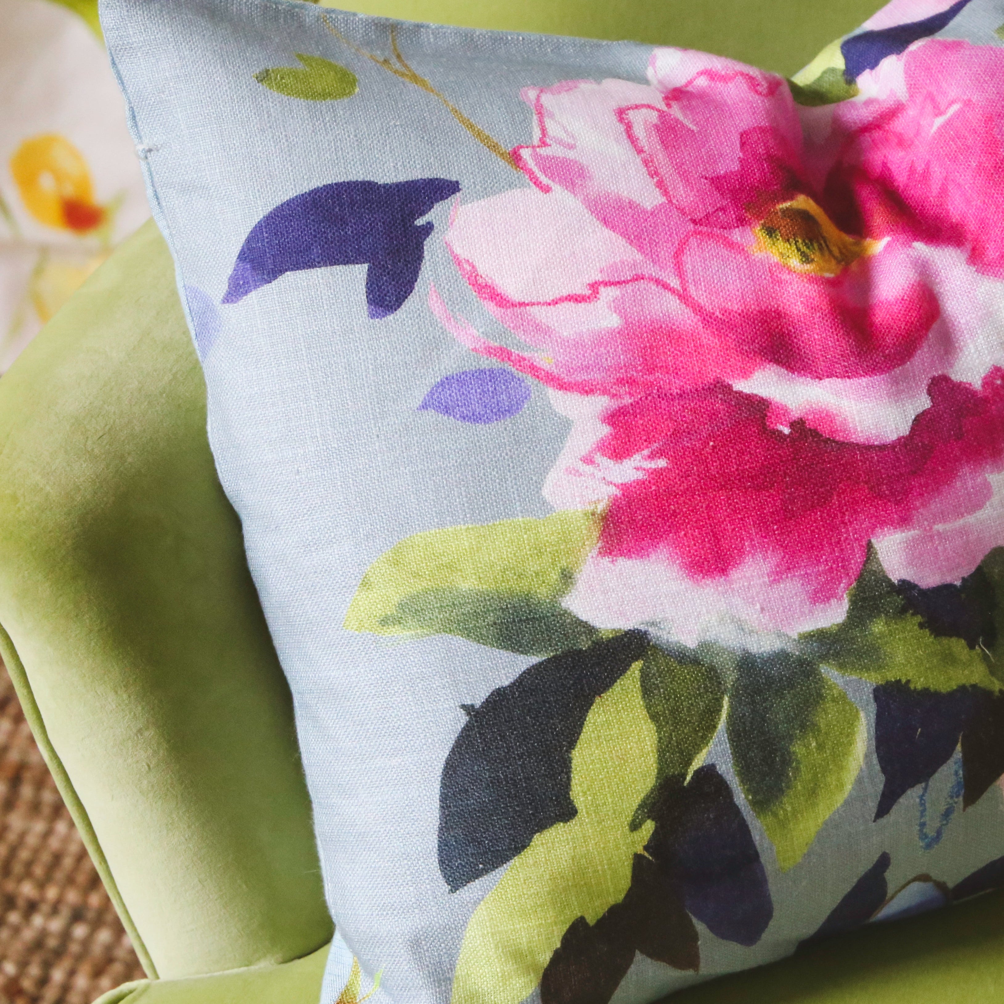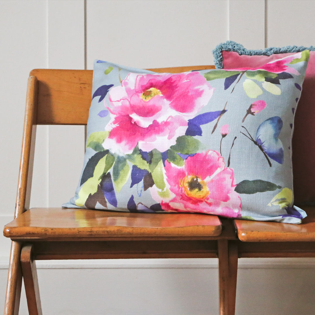 This Teal Butterfly Cushion features pink watercolour peonies, yellow sunflowers and blue butterflies. Feather filled. Made in Scotland.