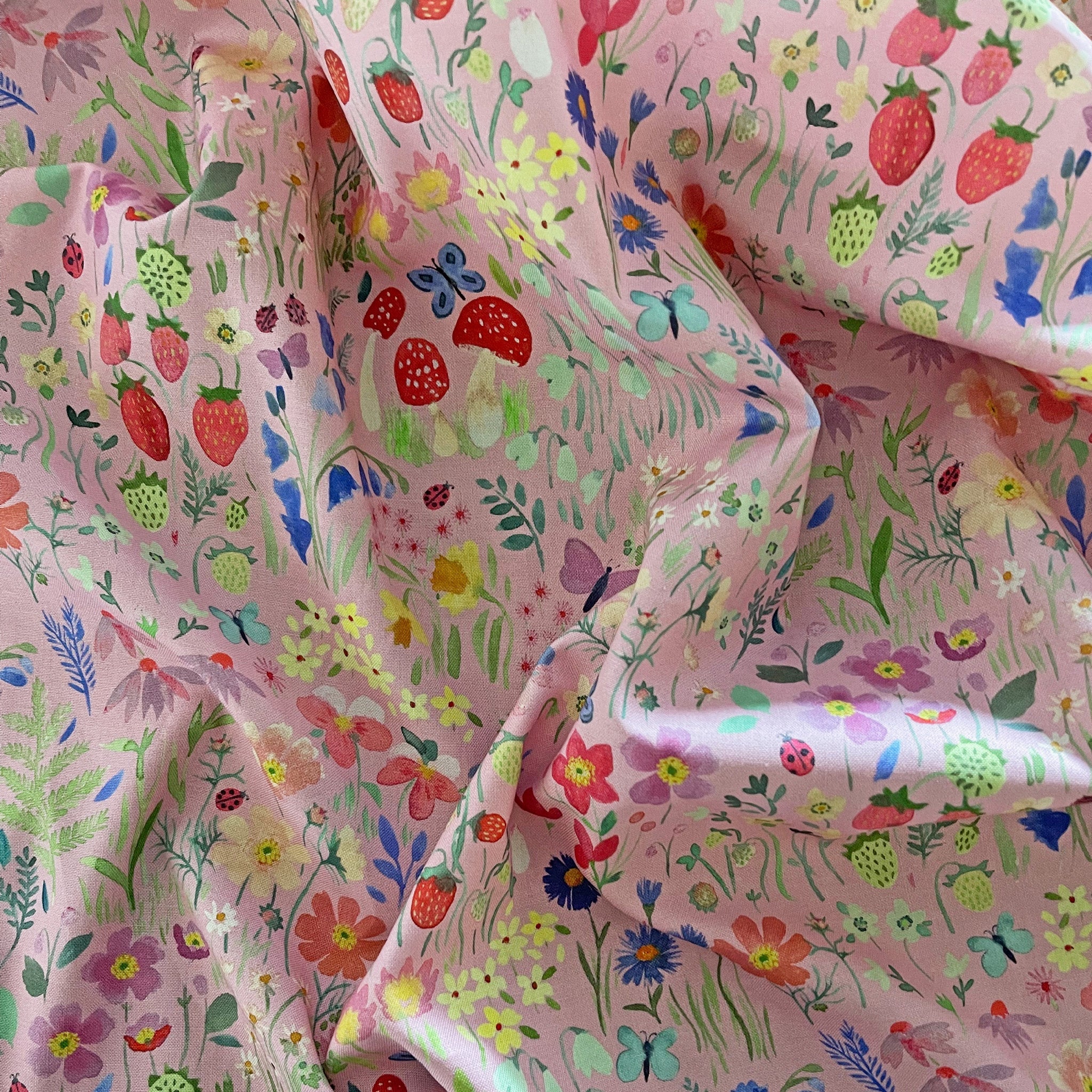 Step into your very own joyful Secret Garden, with delicate bluebells, fluttering butterflies, juicy strawberries, and fresh foliage. We think there is a ladybird hiding in there too! This is the collection for those little ones who love to pick flowers and run wild and free. From delicate florals to colourful ginghams, our hand-painted designs evoke a sense of nostalgia and fun. Delight in the playful palette of petal pink, grass green, cornflower and lilac. Whatever your craft project, Secret Garden, encourages bold pattern mixing and guarantees fun – let your imagination run wild!