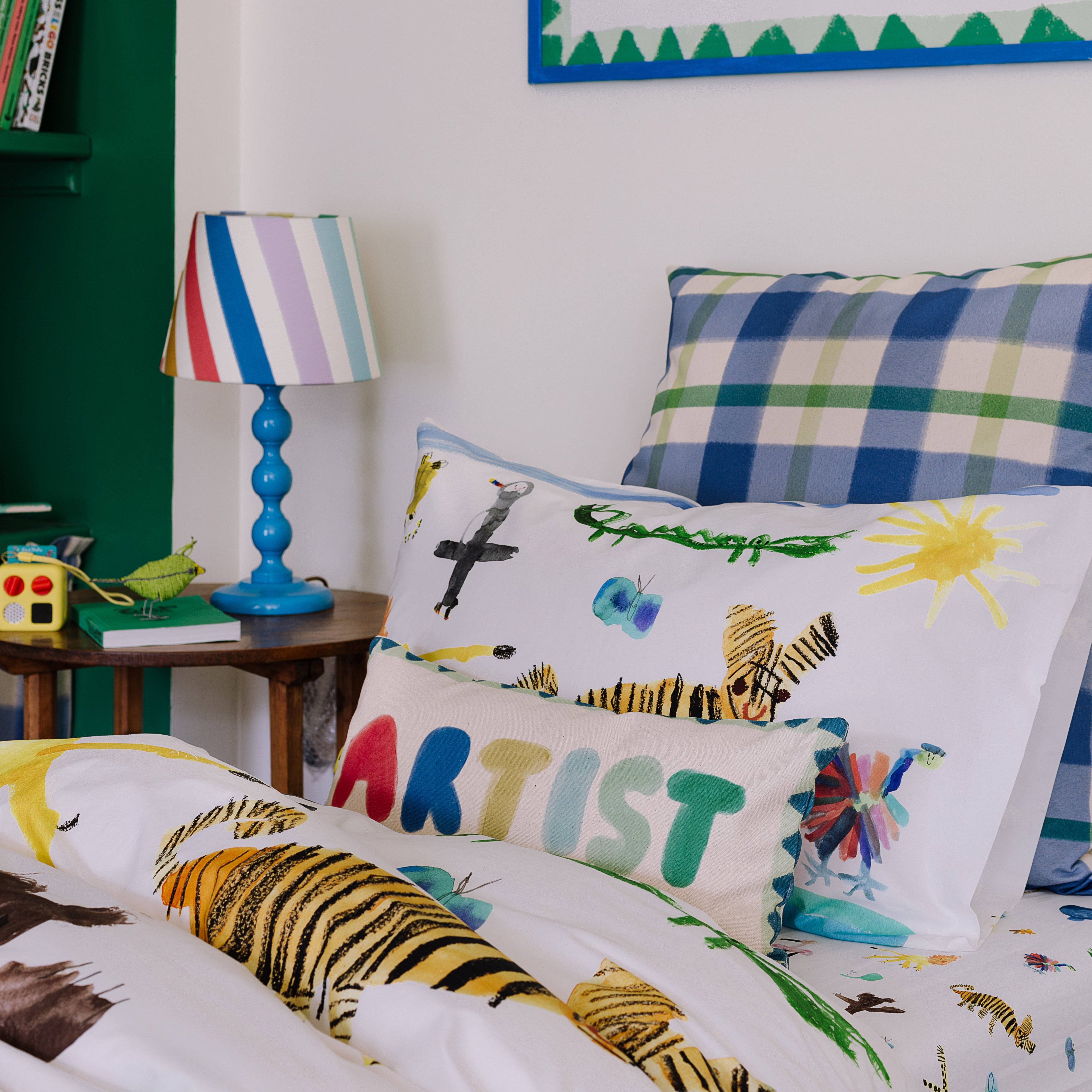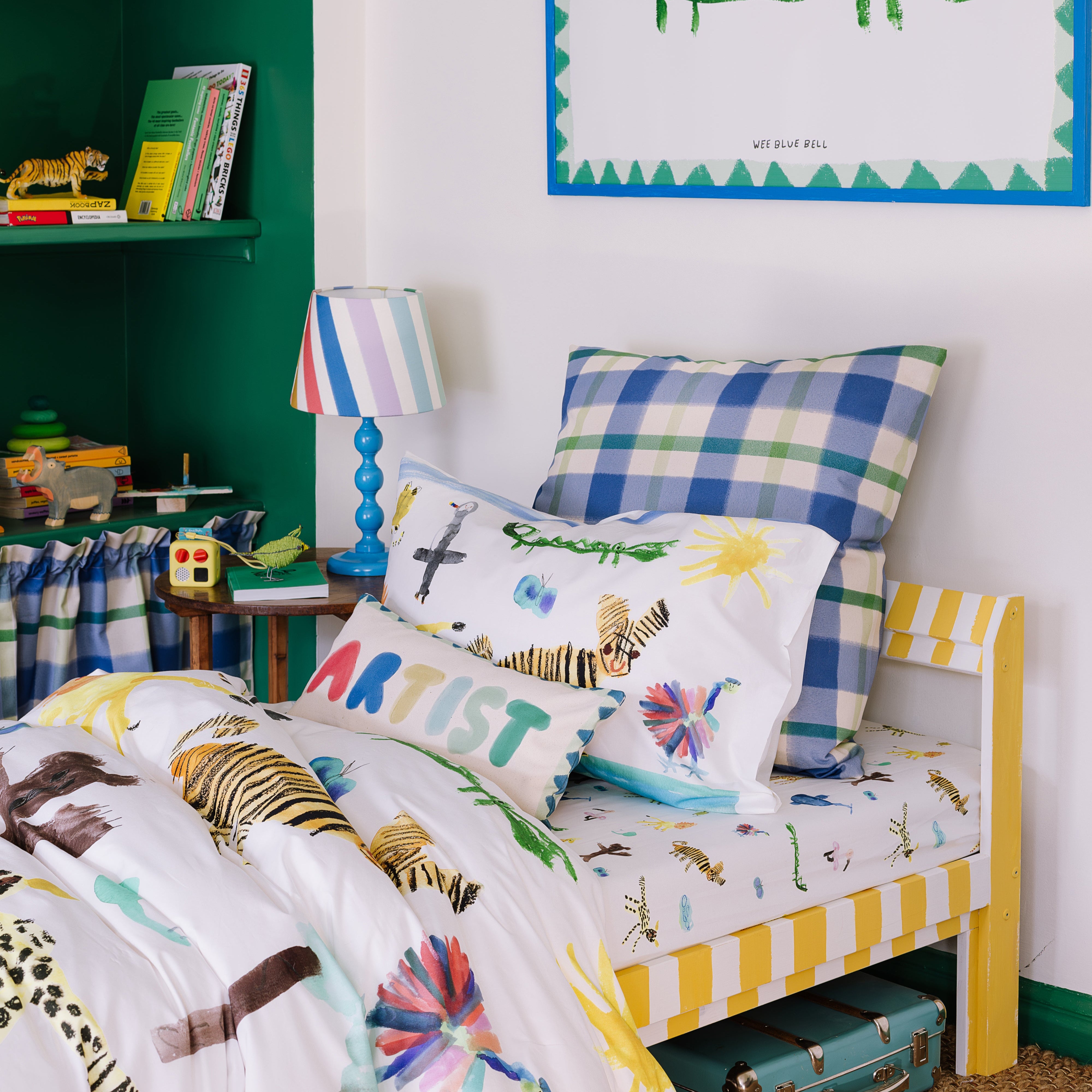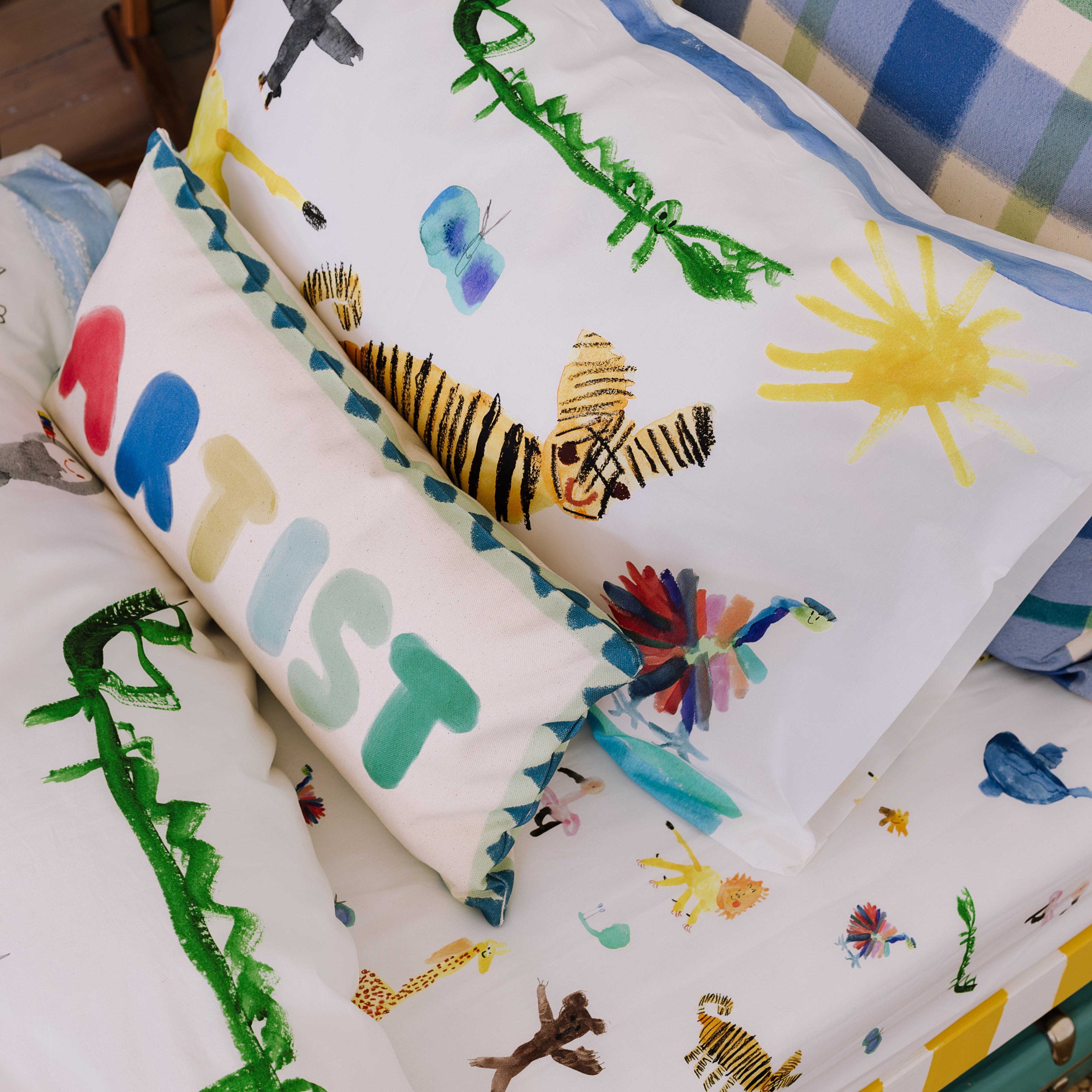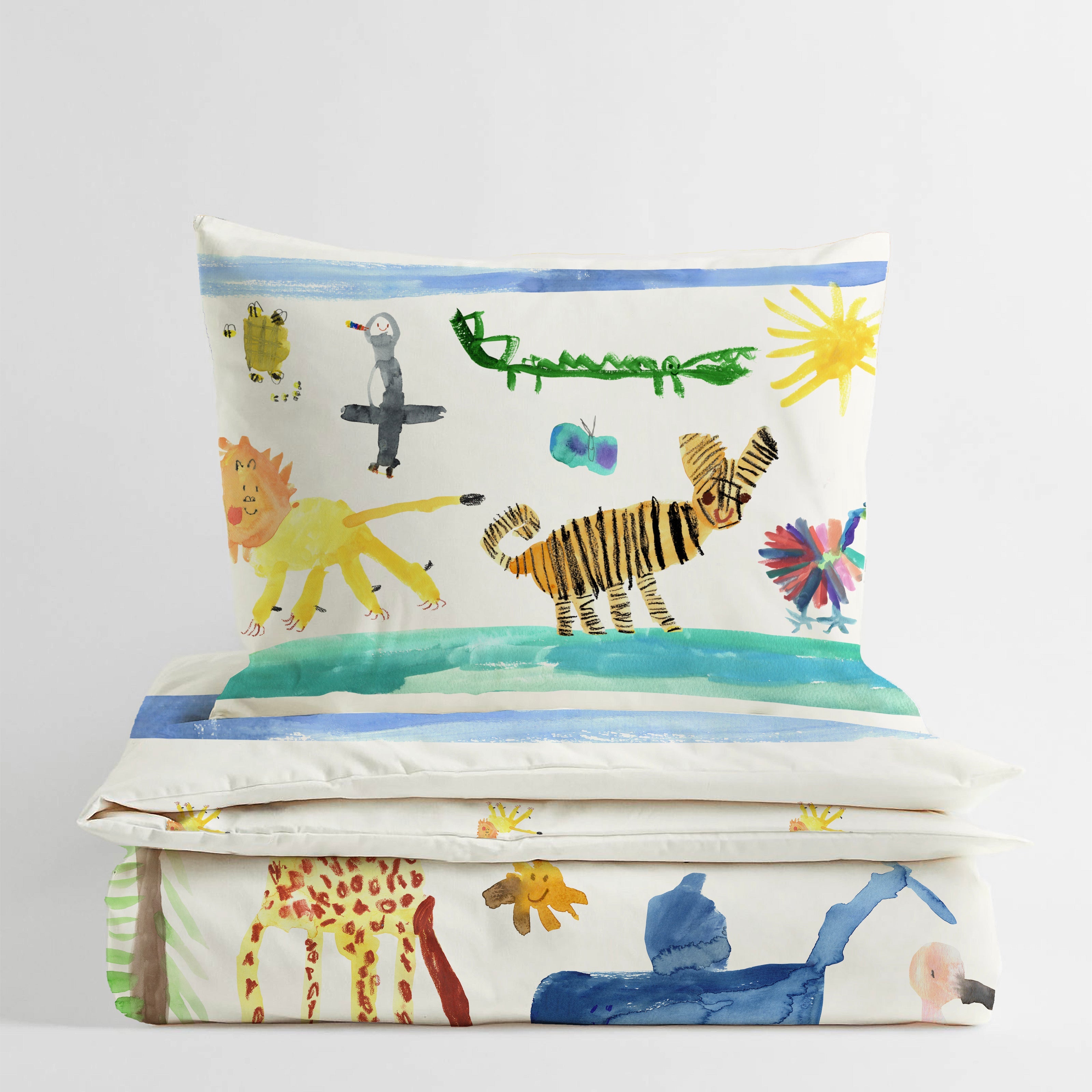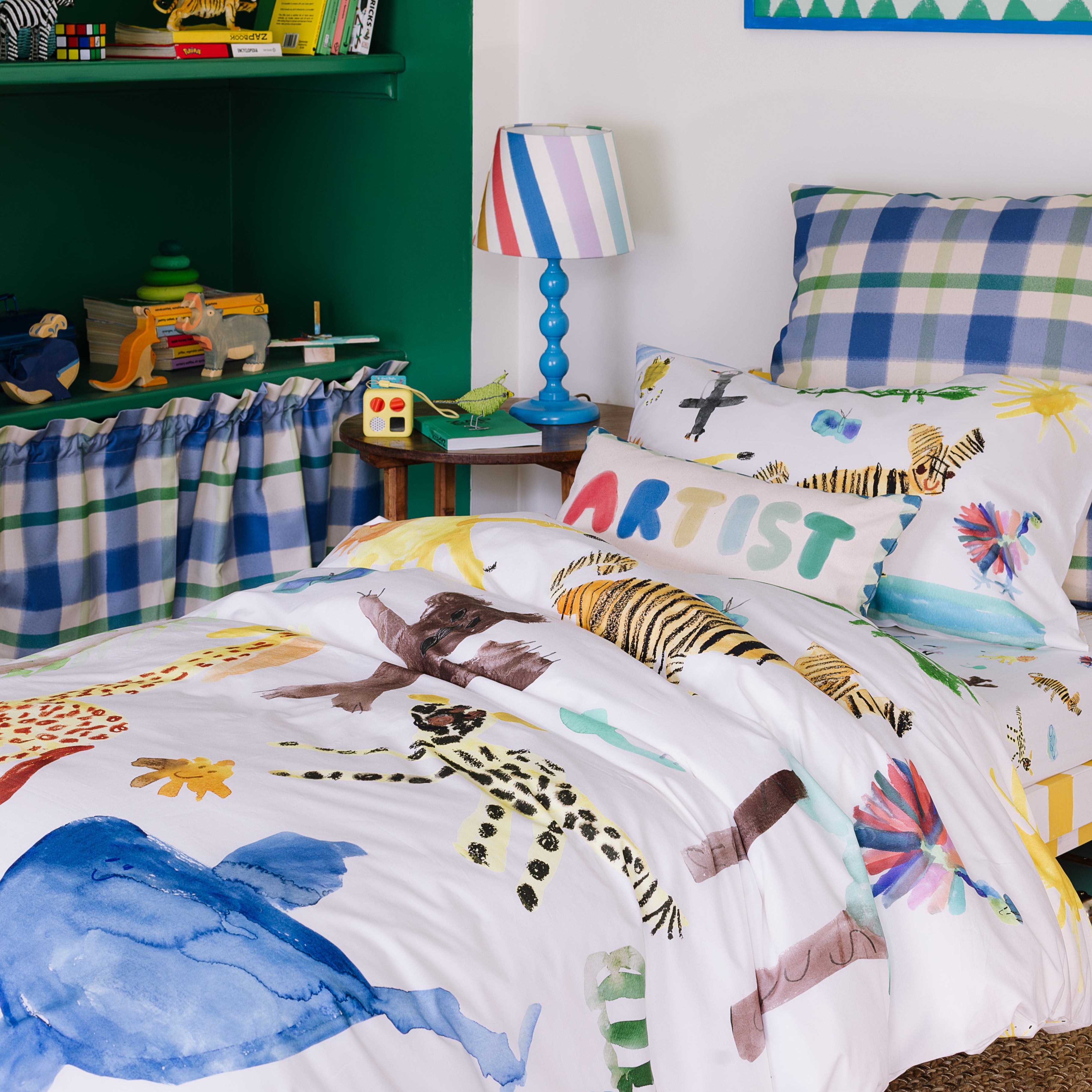 All the wonderful animals on this design have been hand drawn by Archie and Ted, Fi’s two little boys. They love drawing animals and their cute drawings bring so much fun and personality to the design. A truly unique concept to put children’s drawings on children’s duvets, this design is designed by kids for kids. It will spark little imaginations and hopefully inspire new little artists.