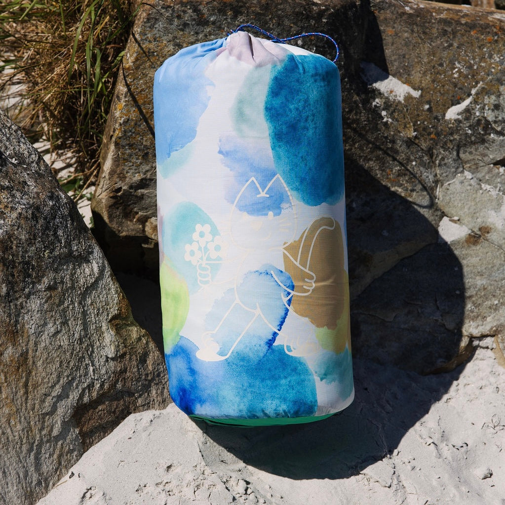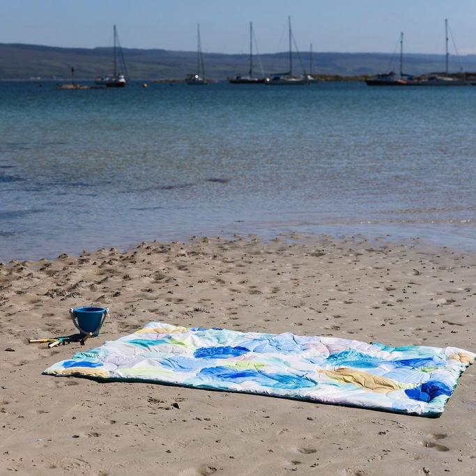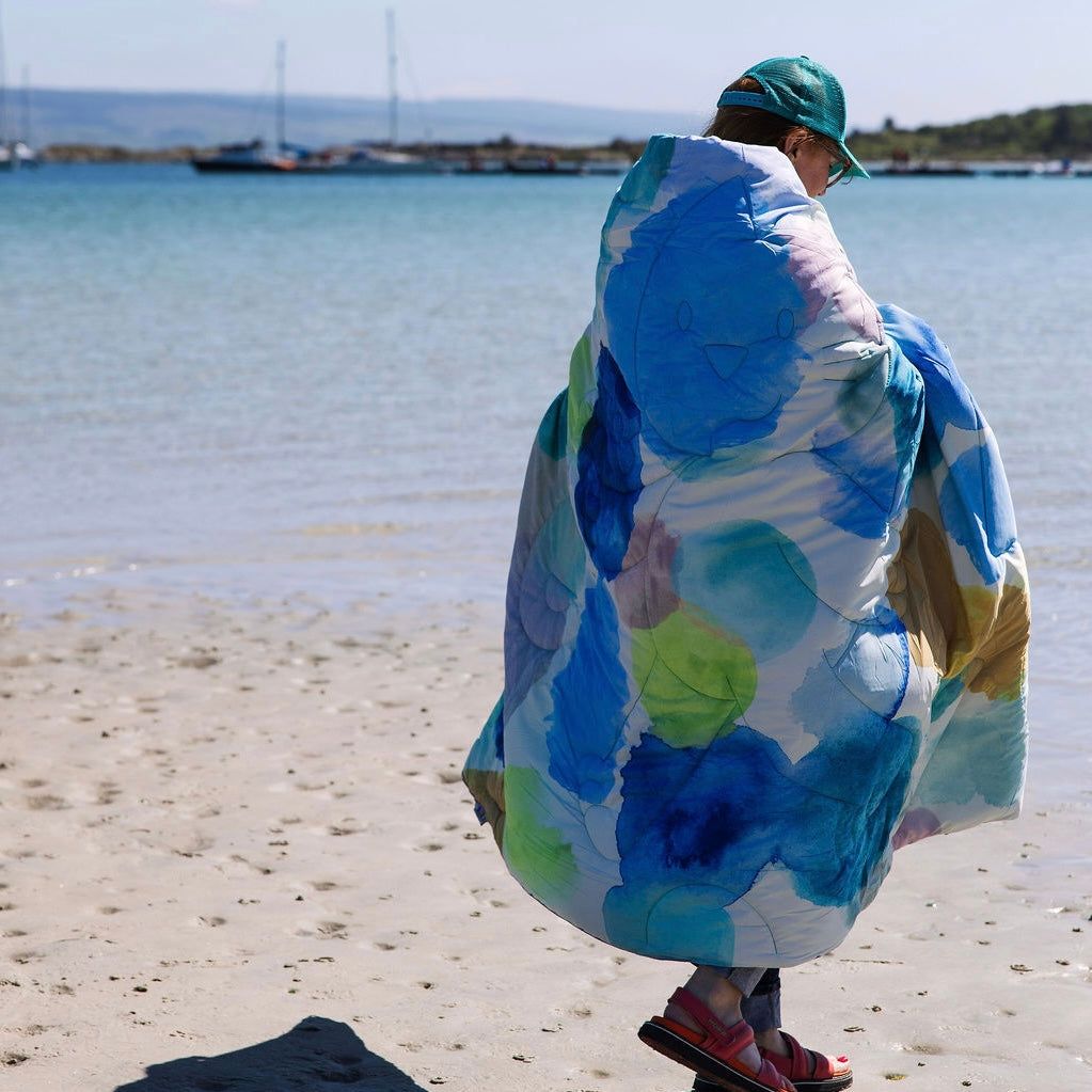 Made from 100% post-consumer recycled plastic bottles, it's waterproof, sand-proof, lightweight, and packable—perfect for picnics, beach days, wild swims and campsite evenings. Clever poppers let you wrap up warm post-swim or stay snug while stargazing.