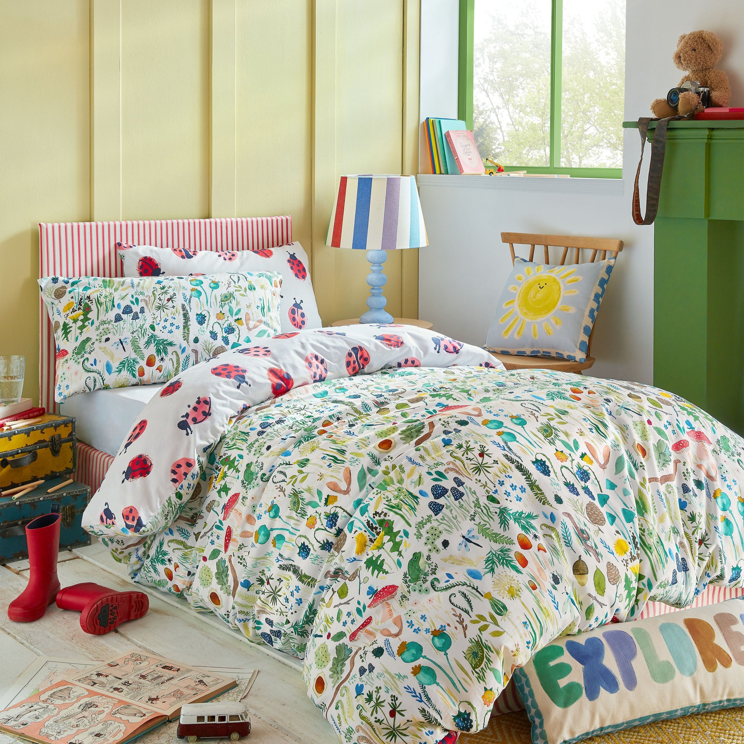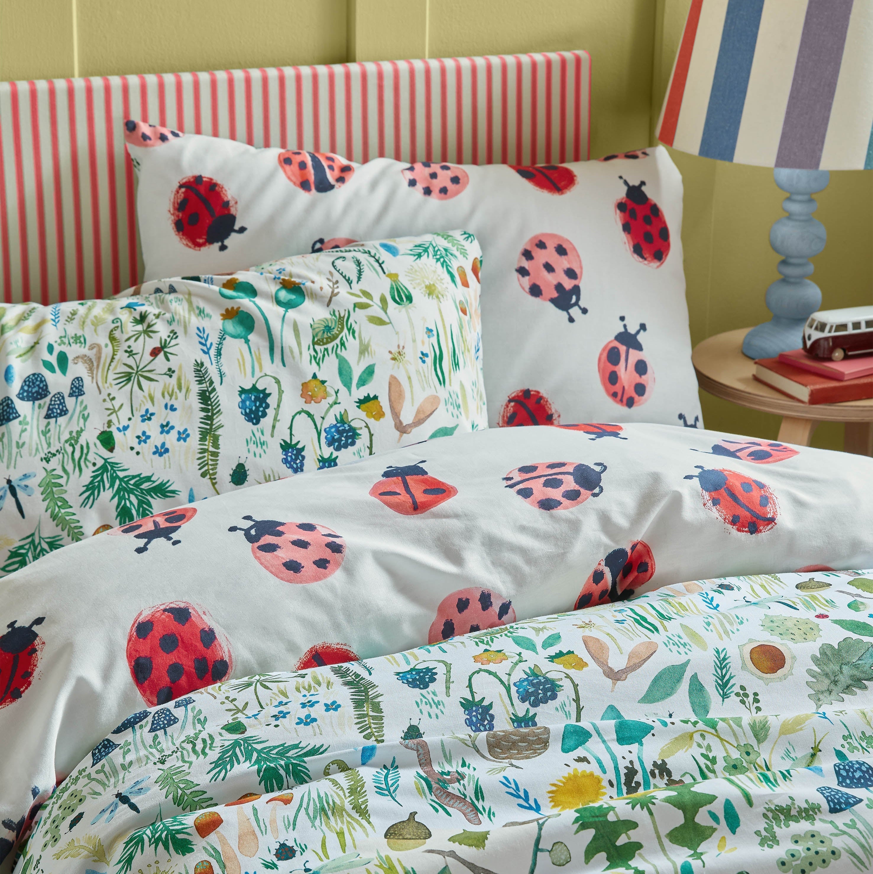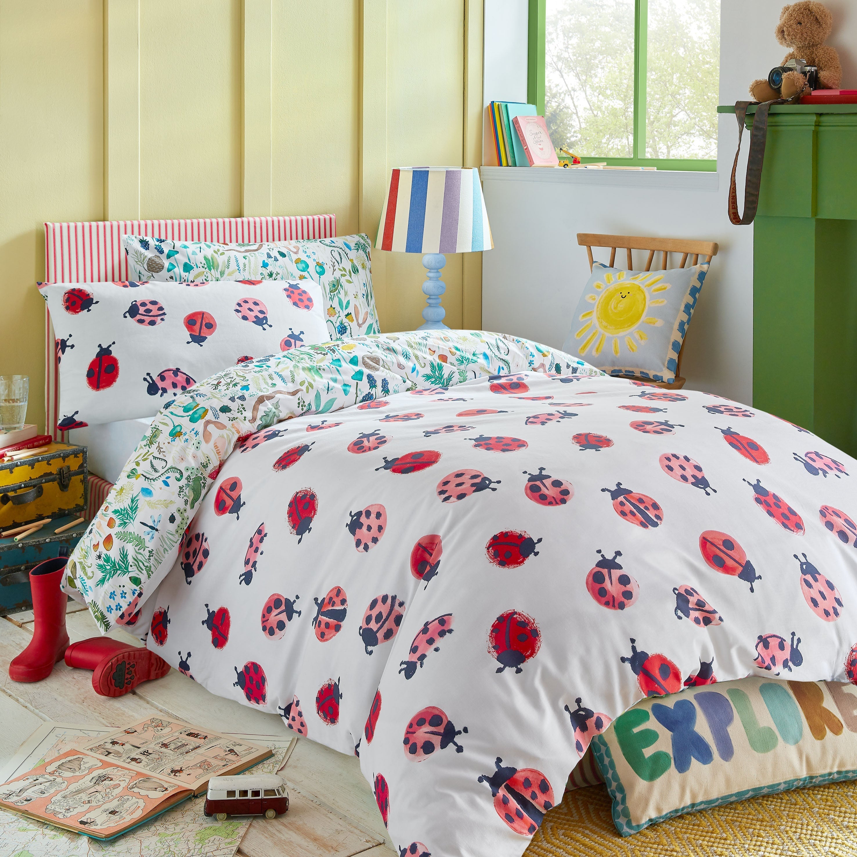 Down the garden path lined with sweet toadstools, and wild foliage, there lived a group of playful and curious frogs - can you find them? This design captures the spirit of a true explorer and forager. This is for the adventurous kids that love muddy puddles, filling their pockets with acorns and climbing trees. The second design of this fully reversible duvet cover features everyone’s favourite friendly ladybirds. Universally loved by gardeners for the good they bring to a garden, ladybirds are also universally loved by children, so it’s a gorgeous pattern to bring to a child’s room. In a joyful palette of soft greens, muted reds, sunny yellows and Printed onto a natural white 100% cotton. Wee Blue Bell is an independent design studio in Scotland, dedicated to creating colourful, joy-filled designs that are loved by children and grown-ups alike - designed to be age-neutral and lasting, so they grow happily with your little one.
