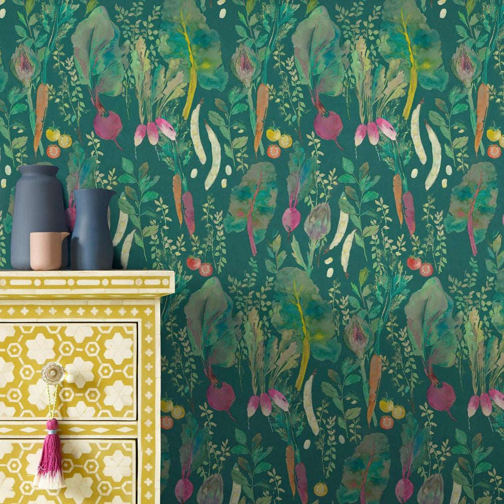 Vegetable Patch Chard wallpaper is an uplifting and playful design, perfectly suited for decorating a kitchen, dining or garden room. Painterly vegetables including beetroot, tomatoes, carrots and artichokes bring the outdoors in, appearing on a calming, deep green background. This wallpaper would create a lively and inviting decorating scheme. This wallpaper is sold as a single 10m roll. Each roll is 52cm wide and a straight match. Our wallpapers include full hanging instructions.