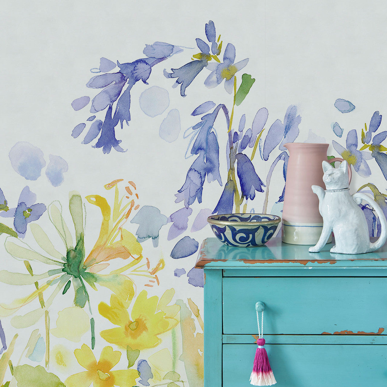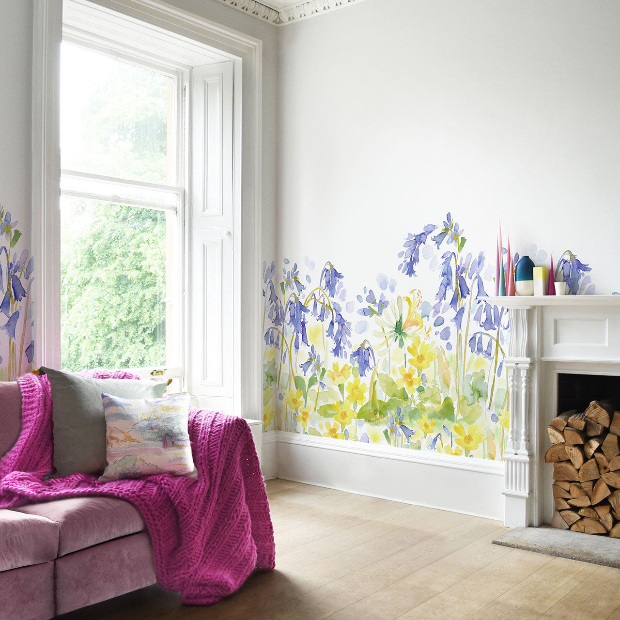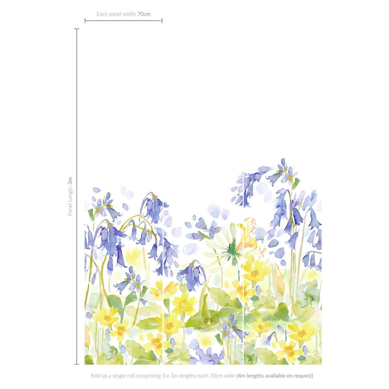 All of our wallpaper samples are A4 in size. Features and information including design repeats, roll widths and pack sizes are also included. Make a design statement with the bluebellgray wallpaper collection; each original watercolour design is created in the Scottish print studio. The Bluebell Woods Mural features sun-drenched bluebells entwined with wild honeysuckle in a vibrant colour palette of sunny yellows and deep blue hues.