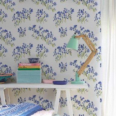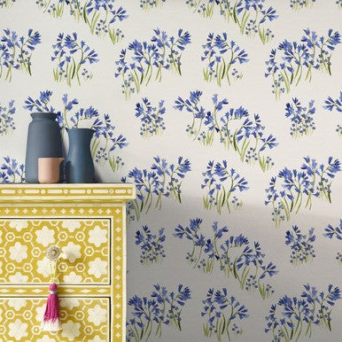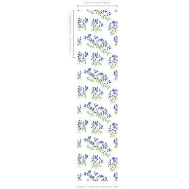 All of our wallpaper samples are A4 in size. Features and information including design repeats, roll widths and pack sizes are also included. These iconic flowers are a favourite with Fi, and a sure sign of spring being just around the corner. The deep blue watercolour tones bleed into delicate bell shaped marks, with the bright blue forget me nots peaking through the woodland grasses. The grouping of flowers create a beautifully spaced, contemporary design.