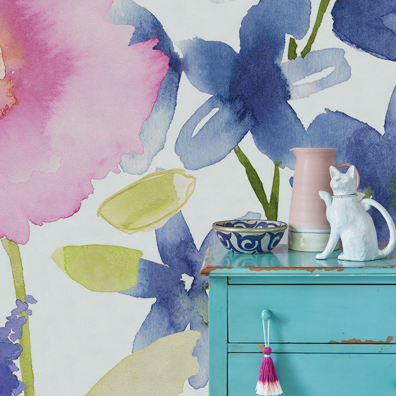 All of our wallpaper samples are A4 in size. Features and information including design repeats, roll widths and pack sizes are also included. Decorate fearlessly with our super scale Florrie mural. The painterly oversized florals make a true design statement in your home while the delicate colour palette keeps the design looking fresh and contemporary.