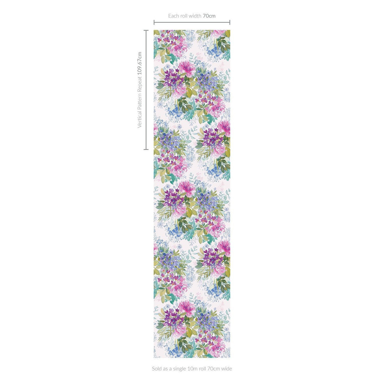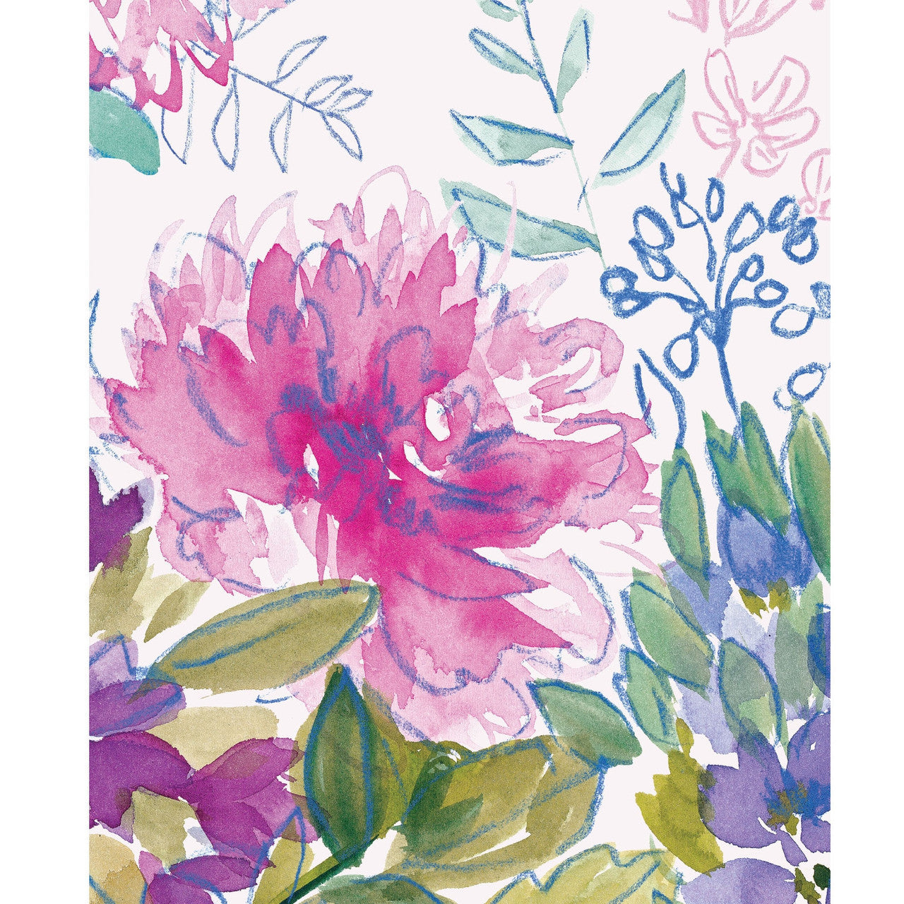 All of our wallpaper samples are A4 in size. Features and information including design repeats, roll widths and pack sizes are also included. Born from original sketches created in the tranquil gardens of Bahia Palace in Morocco, Ines features an array of cascading, watercolour blooms and foliage in a contemporary colour palette of zesty greens, bright pinks and deep purple.