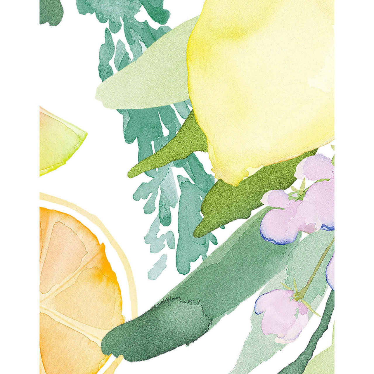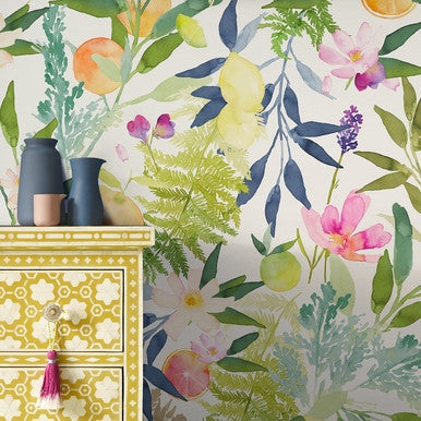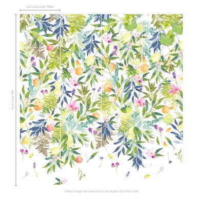 Capture the essence of a sun drenched orchard in the Spanish hills with our Valencia wallpaper. This floral wallpaper features a vibrant array of ombre ferns and foliage, refreshing fruits and delicate blooms, creating a modern and fresh floral design. This impactful design would create a stunning focal point in your decorating scheme. The matt coated paper provides a smooth matt finish. This wallpaper is sold as a single roll comprising 4 x 3m lengths (panel A, panel B, panel C, panel D) which have been created to sit together to provide a large scale design. Each roll is 70cm wide and a straight match.