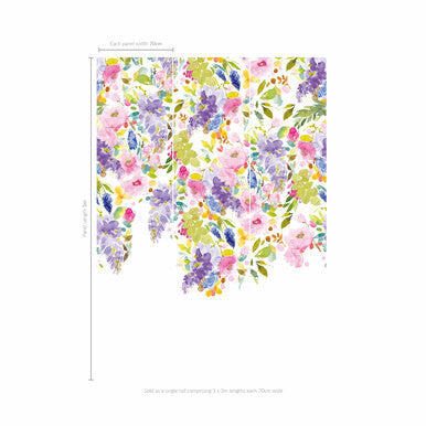 The Wisteria Garden mural features Fi’s signature, oversized, watercolour florals in delicate purples and pinks with soft greens in pretty, painterly brushstrokes inspired by a British country garden. All of our wallpaper samples are A4 in size. Features and information including design repeats, roll widths and pack sizes are also included. Click hereto purchase a full roll. Or for more wallpaper samples, take a look at our vibrant selection of modern floral wallpaper.
