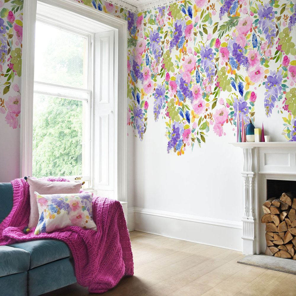 Add a breath of fresh air to your living spaces with Wisteria Garden, a large-scale mural that's been transformed into a modern floral wallpaper. Inspired by a British country garden, Fi's signature watercolour florals in delicate purples, pinks and soft greens are printed on uncoated paper for an innovative, natural matte finish.