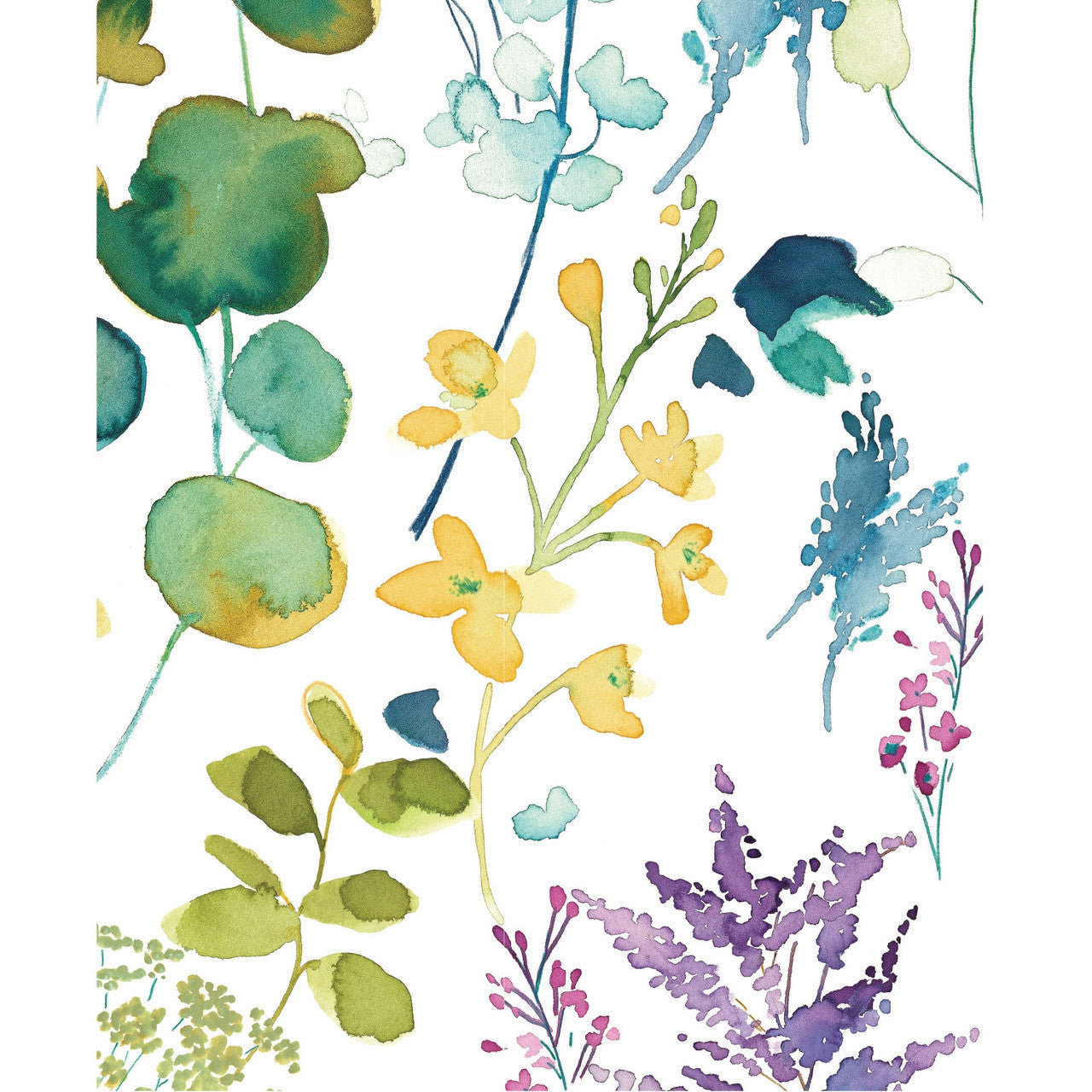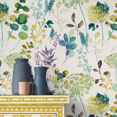 Hidden amidst the busy streets of Marrakech, the Secret Garden is thriving with plants and trees. The shades of green combined with the teal tiles inside the grounds inspired Fi to create this colourful wallpaper of florals and foliage.